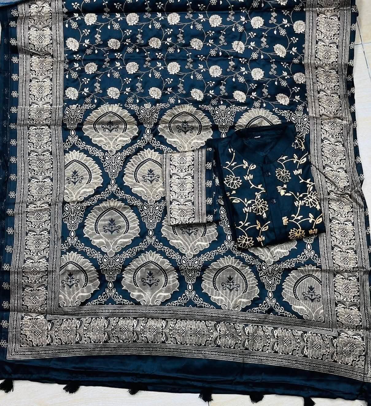 বেনারসি সিল্ক শাড়ি+ব্লাউজ+পাঞ্জাবি – S1 (কালো)